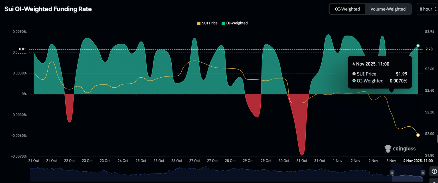 尽管如此,投资者似乎仍在寻求通过衍生品市场的多头头寸来获取投资机会,未平仓合约加权融资率从周一的0.0002%升至0.0070%便印证了这一点。该指标的稳步上升表明,随着SUI股价在2美元支撑位上方徘徊,交易员们看到了新的机会。