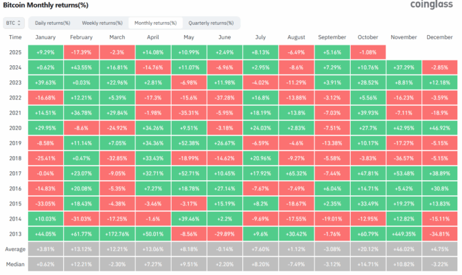 这就是Coinglass 数据显示此前,比特币自推出以来,仅有两个十月(2014 年和 2018 年)出现下跌。除此之外,我们看到比特币全线上涨,早些年反弹幅度高达 60% 以上。