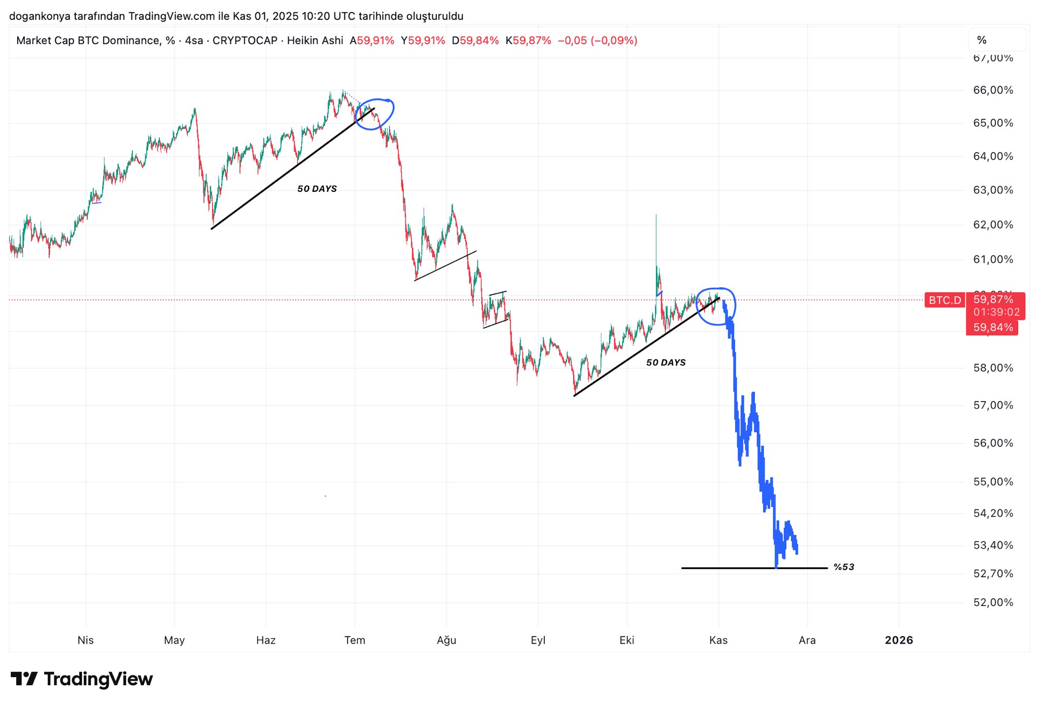 根据 PlanD 的预测,比特币的主导地位目前正形成类似的趋势,这与 2025 年 7 月的山寨币上涨行情遥相呼应。值得注意的是,BTC.D 在跌至重要水平之前,曾维持了约 50 天的上涨趋势,这代表着大量资金转向比特币以外的其他加密货币。