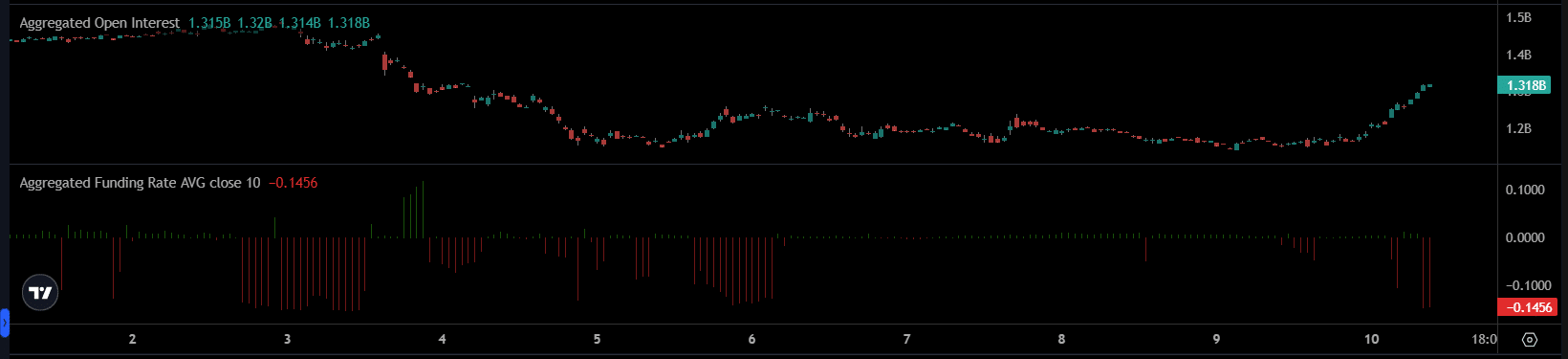 XRP 的未平仓合约量达到 13.2 亿美元,但融资利率仍为负值。