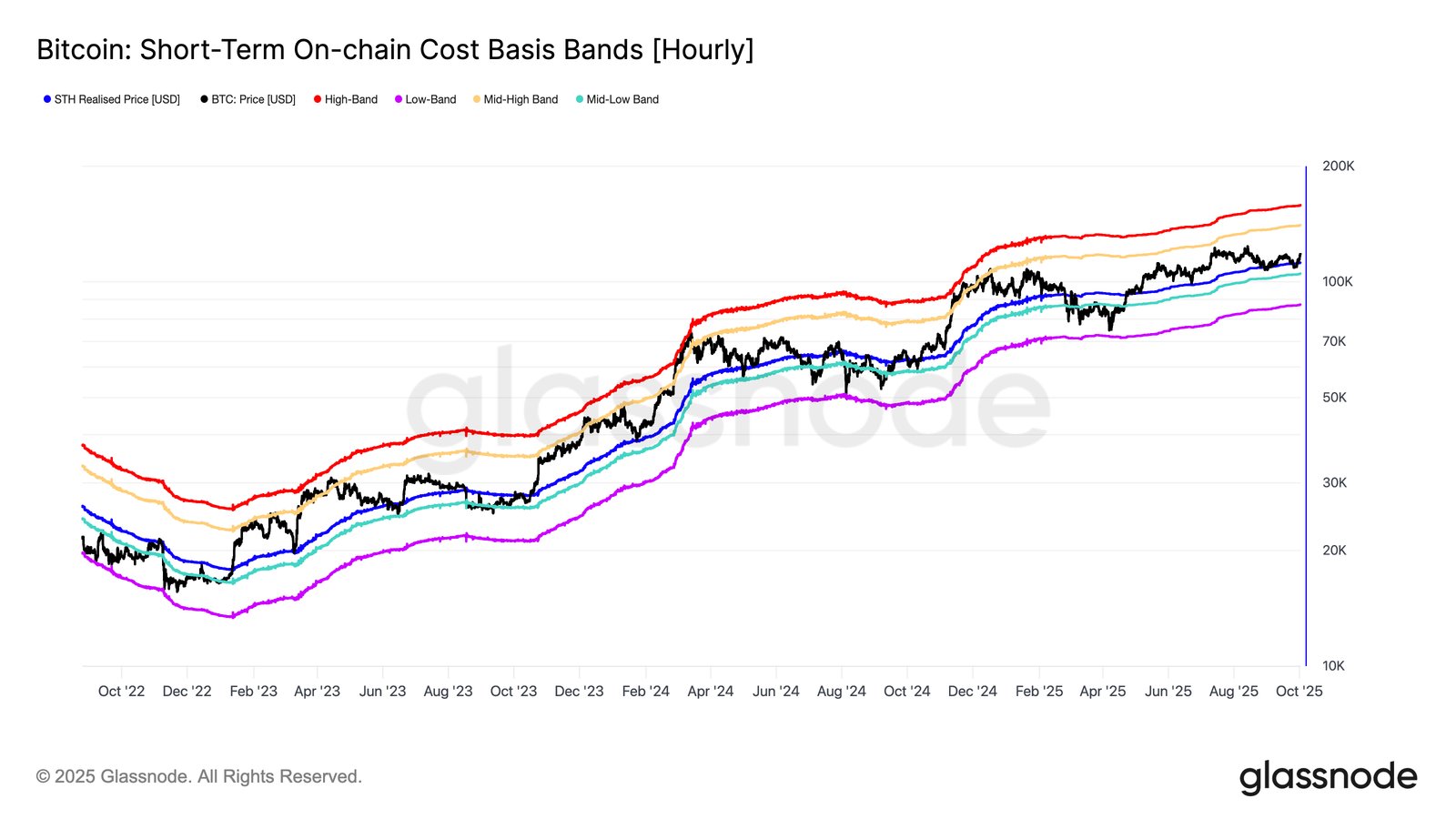 值得注意的是,此次价格下跌也凸显了比特币短期持有者(STH)群体的韧性。Glassnode数据显示,STH成本基差(即近期买家的平均购买价格)约为111,600美元。自5月份以来,该水平已五次被守住,使其成为当前市场周期的重要转折点。