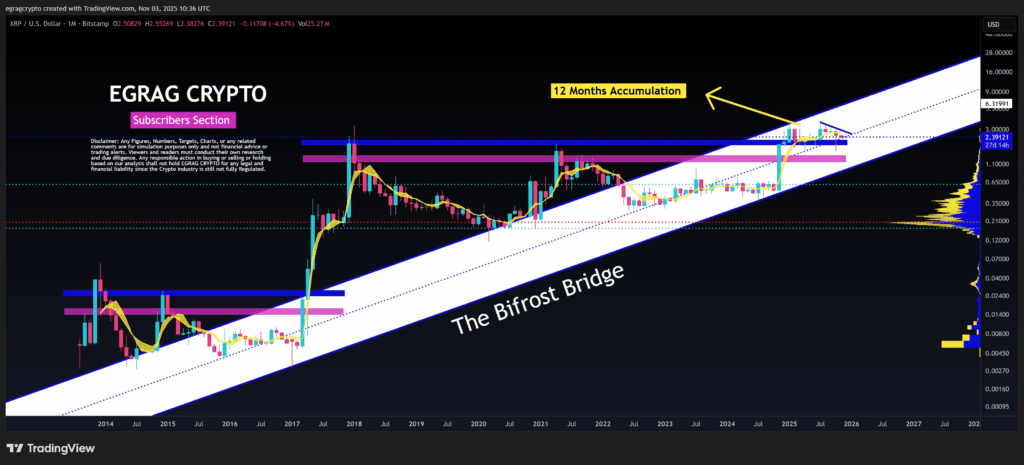 交易员 Egrag Crypto 在 11 月 3 日分析了 XRP 的价格结构,指出该代币自诞生以来,价格已经超过了每一根主要实体蜡烛图。