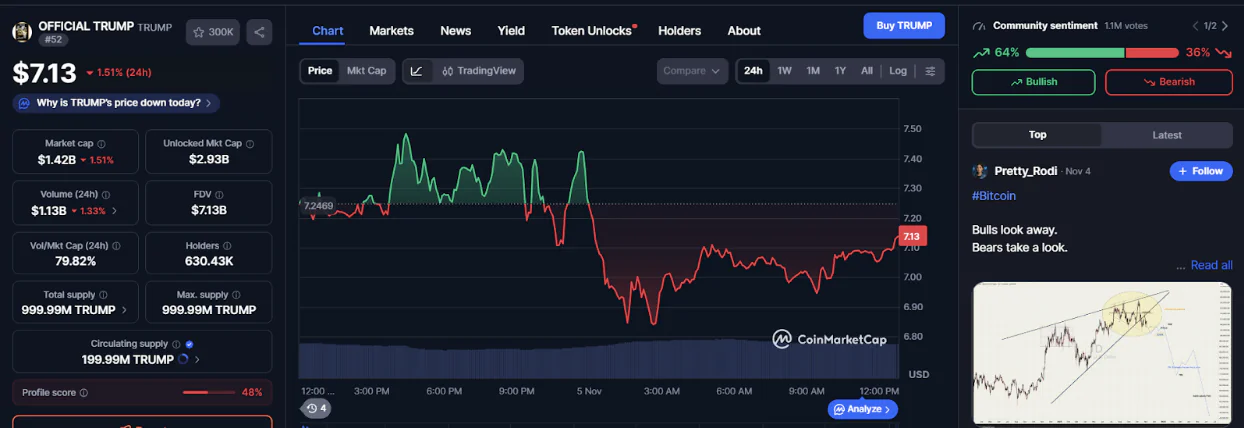 这特朗普表情包硬币价格预测随着市场波动加剧和交易者信心下降,投资者变得越来越谨慎。该代币目前的价格约为7.08美元,带着一个24小时交易量为15.3亿美元波动率水平接近12.69%——这是不稳定的明显迹象。