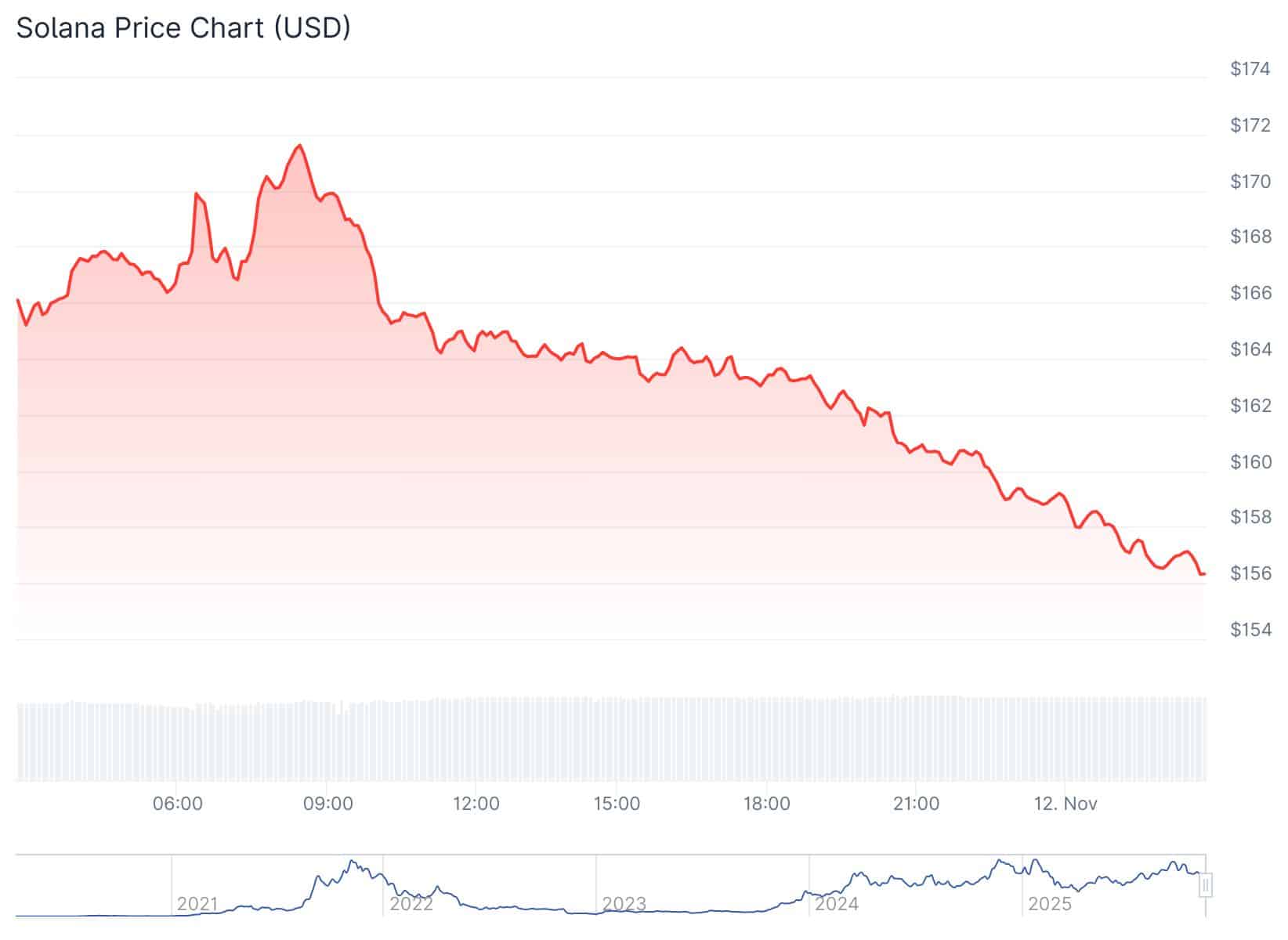 过去一天,SOL 股价在 156 美元至 172 美元之间窄幅波动,交易量约为 60 亿美元。