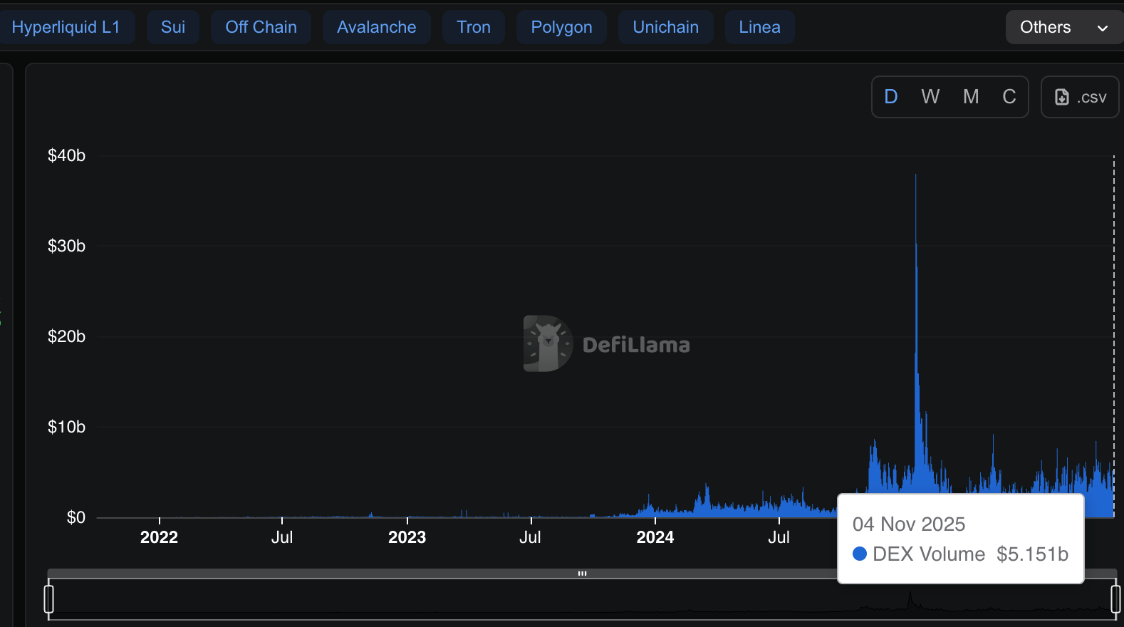 交易活动活跃。过去一天,基于 Solana 的去中心化交易所 (DEX) 处理了约 51.5 亿美元的交易量。