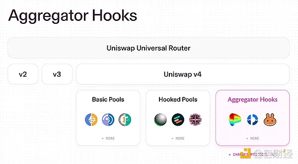 这些钩子从其他链上协议获取流动性,并在此基础上添加程序化的 UNI 销毁,使 Uniswap v4 本身变成任何人都可以集成的聚合器。