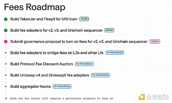 TokenJar 和 Firepit 已实现,同时还提供了 v2、v3 和 Unichain 的适配器。PFDA、v4、聚合器钩子以及用于 L2 和其他 L1 费用的桥接适配器正在开发中,并将通过未来的治理提案引入。