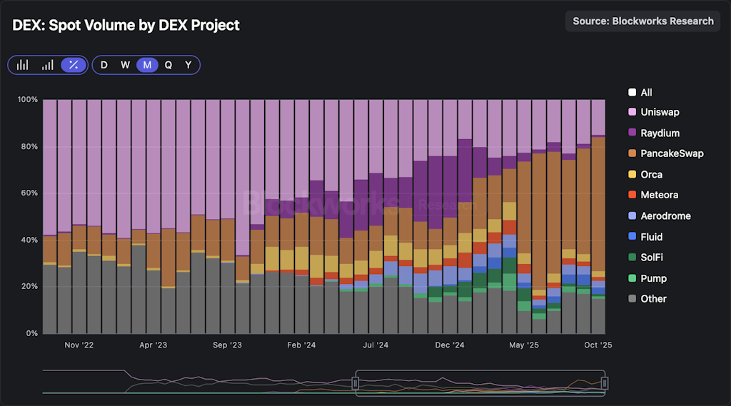 既然 Uniswap 将在代币价值与协议成功之间建立清晰的价值积累机制,那么 UNI 的合理价值是多少?过去两年,Uniswap 在去中心化交易所 (DEX) 领域的领先地位有所下降,交易量市场份额从 2023 年 10 月的 60% 以上跌至上个月的不足 15%。DEX 市场份额的变化反映了 Solana 同期在链上交易活动中日益增长的主导地位,以及诸如其他协议的崛起。机场并且已经成功地在 Uniswap 上保持领先地位根据.