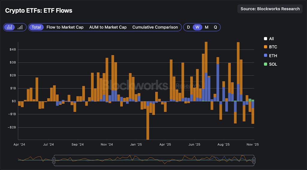 尽管黄金表现逊于比特币,但比特币在周一迎来了一丝喘息之机,此前两周ETF资金净流出总额高达20亿美元。其中近一半的资金流出来自贝莱德旗下的IBIT。本周ETF资金流动能否重拾势头,值得关注。