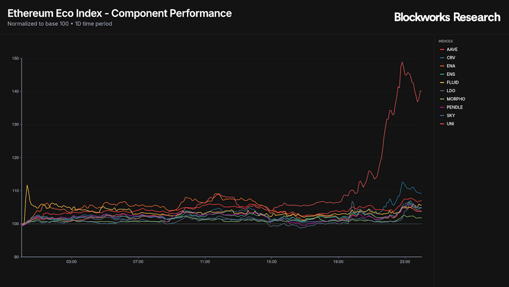 就交叉指数表现而言,周一表现最为突出的是以太坊指数和Solana生态系统指数,分别上涨了7.9%和5.2%。以太坊指数中表现最佳的资产是UNI,在Uniswap Labs和Uniswap基金会联合提出激活协议费用的治理提案后,UNI当日飙升了40%。
