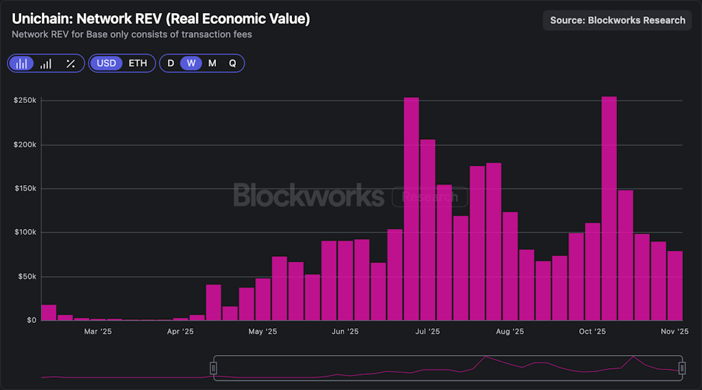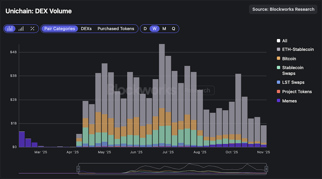以Unichain为例,其网络活跃度依然相对低迷,每周去中心化交易所(DEX)的交易量自7月以来持续下降。上周的交易量为9.25亿美元,是自4月中旬以来的最低水平。