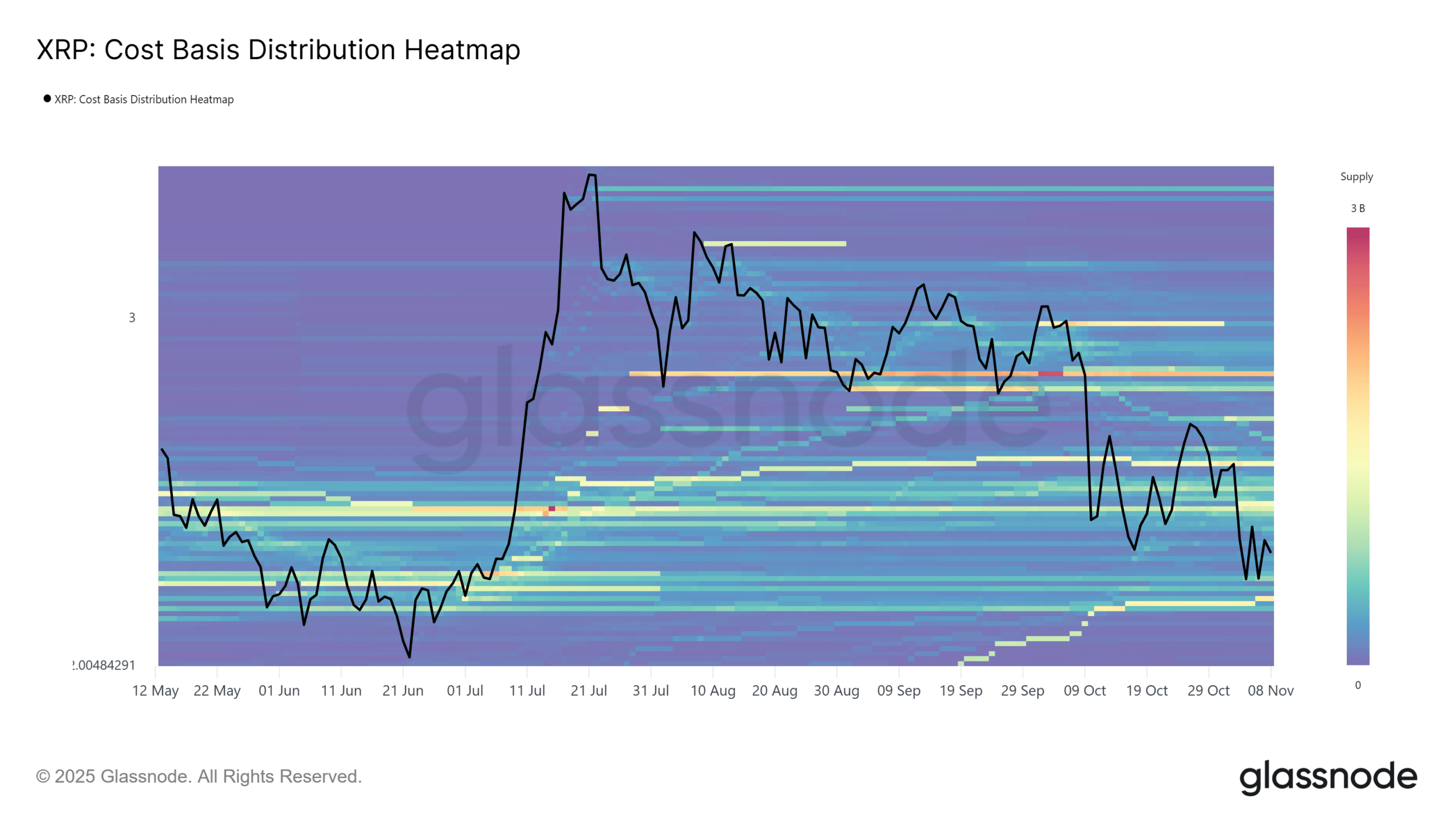 清晰的黄色条带显示,10亿 XRP 的供应量堆积在 3.30 美元水平。
