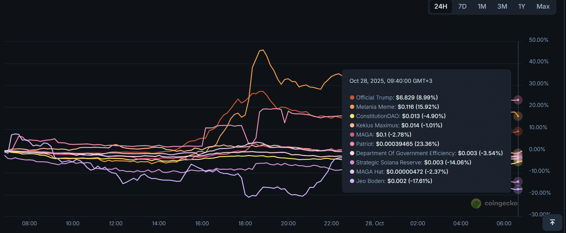 根据科因杰科在过去的 24% 中,特朗普的 memecoin 上涨了约 9%,而梅拉尼娅的 memecoin 则上涨了 15%。