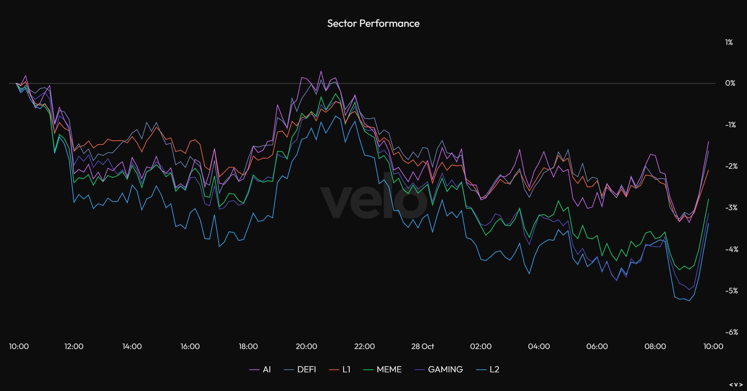 根据 Velo 的数据,在过去 24 小时内,模因币排名第三,但平均下跌了约 3%。数据.