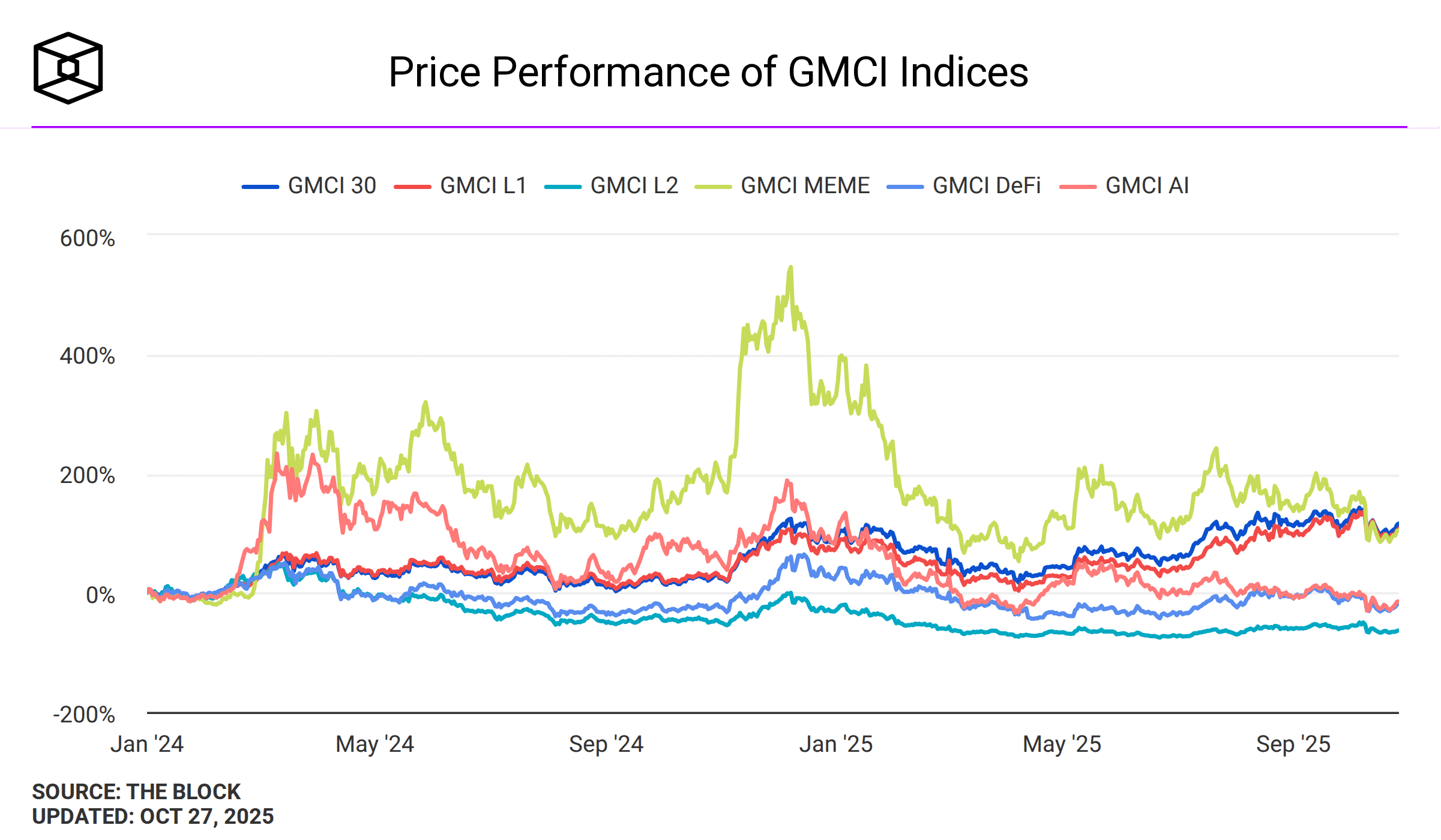 从年初至今来看,根据 GMCI 指数的追踪,模因币排名第三名,回报率为 104%。表现最佳的是 GMCI 30(大盘资产)和 GMCI L1(Layer 1 代币)。