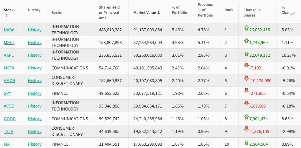 $苹果 (AAPL.US)$ 位列第三,持仓2.37亿股,持仓市值约602.6亿美元,占投资组合比例为3.61%,较上季度持仓数量增长10.2%。