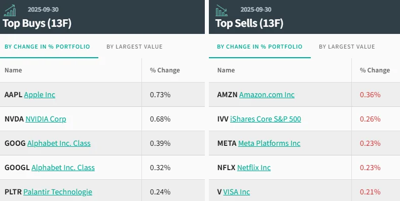 从持仓比例变化来看,前五大买入标的为:苹果、英伟达、Alphabet公司C类股 $谷歌-C (GOOG.US)$ 、Alphabet公司A类股 $谷歌-A (GOOGL.US)$ 和 $Palantir (PLTR.US)$ 科技公司。