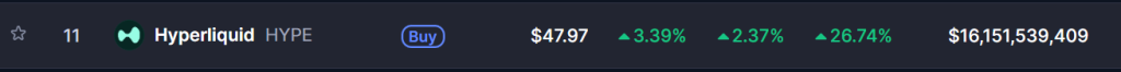 在此之前,HYPE 的价格已经大幅上涨,目前为 47.53 美元。这意味着 HYPE 的价格在短短一周内上涨了 25.4%,进一步增强了其上涨势头。HYPE 的市值也随之增长。上涨1.72%短短24小时内,这一切表明HYPE目前势头强劲,这种势头可能会进一步推高价格。