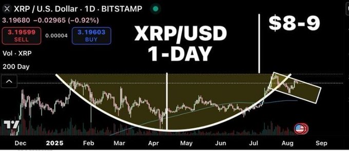 与此同时,一位顶级专家交易员和分析师透露,XRP 价格出现了杯柄形态,其预测目标价为 9 美元。