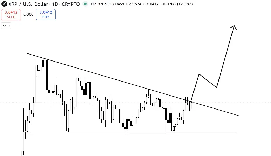 自上次大幅上涨以来,XRP 一直处于一个整齐的下降三角形盘整区域,拒绝了向下倾斜的趋势线,同时在 2.7 美元左右的水平底部获得支撑。目前交易价为 3.03 美元.