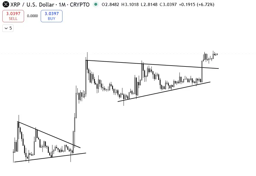 专家表示,XRP 具有很强的跟随重大技术突破的倾向。例如,早在 2017 年 3 月,XRP 就突破了类似的下降三角形形态,在不到一年的时间内,其代币价格飙升超过 35,000%。