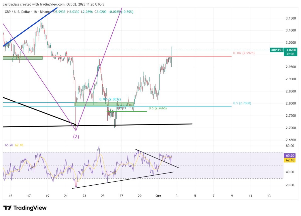 10 月 2 日,XRP 价格跃升至 3 美元以上,过去 24 小时内上涨 3.3%,交易价格达到 3.04 美元。目前,该代币的市值为 1818 亿美元,24 小时交易量超过 61 亿美元。