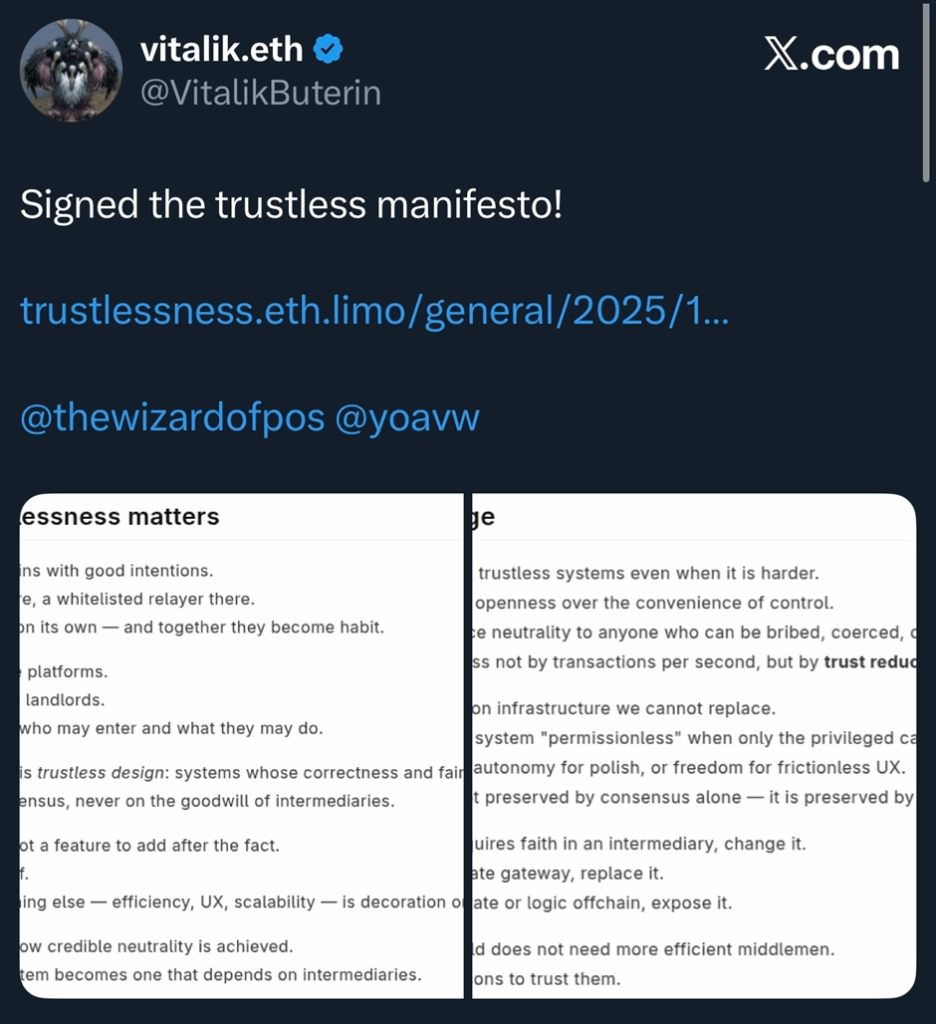 以太坊联合创始人维塔利克·布特林发布了新的《无需信任宣言》。这份文件指出,区块链系统应该在没有中间人或私人控制的情况下运行。