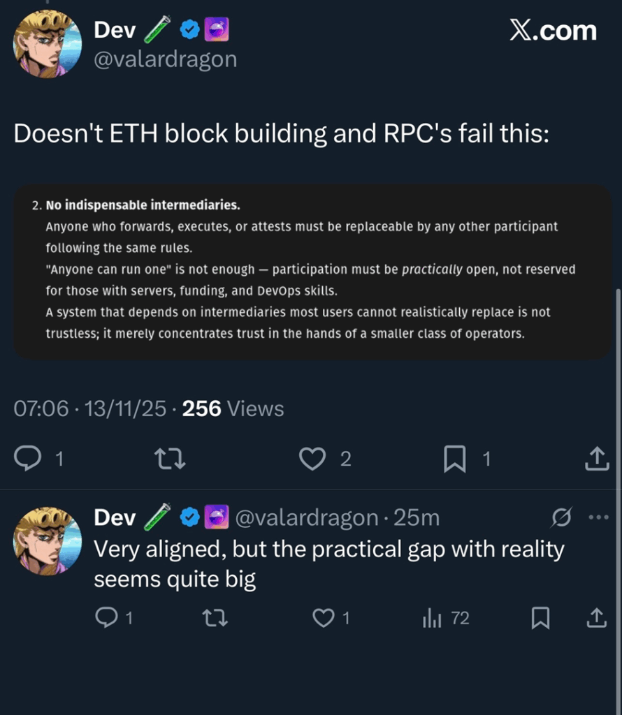 许多用户对这条信息表示赞同,但也引发了一场辩论。社区现在正在质疑,以太坊目前的架构设计是否真正符合这些规则。