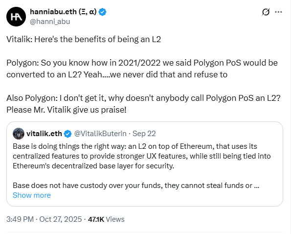 Sandeep 还为 Polygon PoS 辩护,称其实际上“依赖于以太坊”,同时指出 Katana 和 XLayer 等较新的链才是真正的 L2。