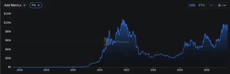“>DeFi生态系统在2025年达到970亿美元,即使在闪电崩盘之后,现在也只有870亿美元。数十亿美元用于放贷,流动性将数字货币或代币快速转换为其他资产或现金而不影响其价格的能力。