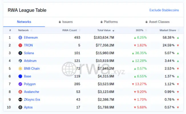 代币化在以太坊的长期增长中也扮演着重要的角色。目前,以太坊占现实世界资产代币化总量的56.99%,价值超过118亿美元。如果算上稳定币,这一比例将上升至58.38%,总价值达1830亿美元。