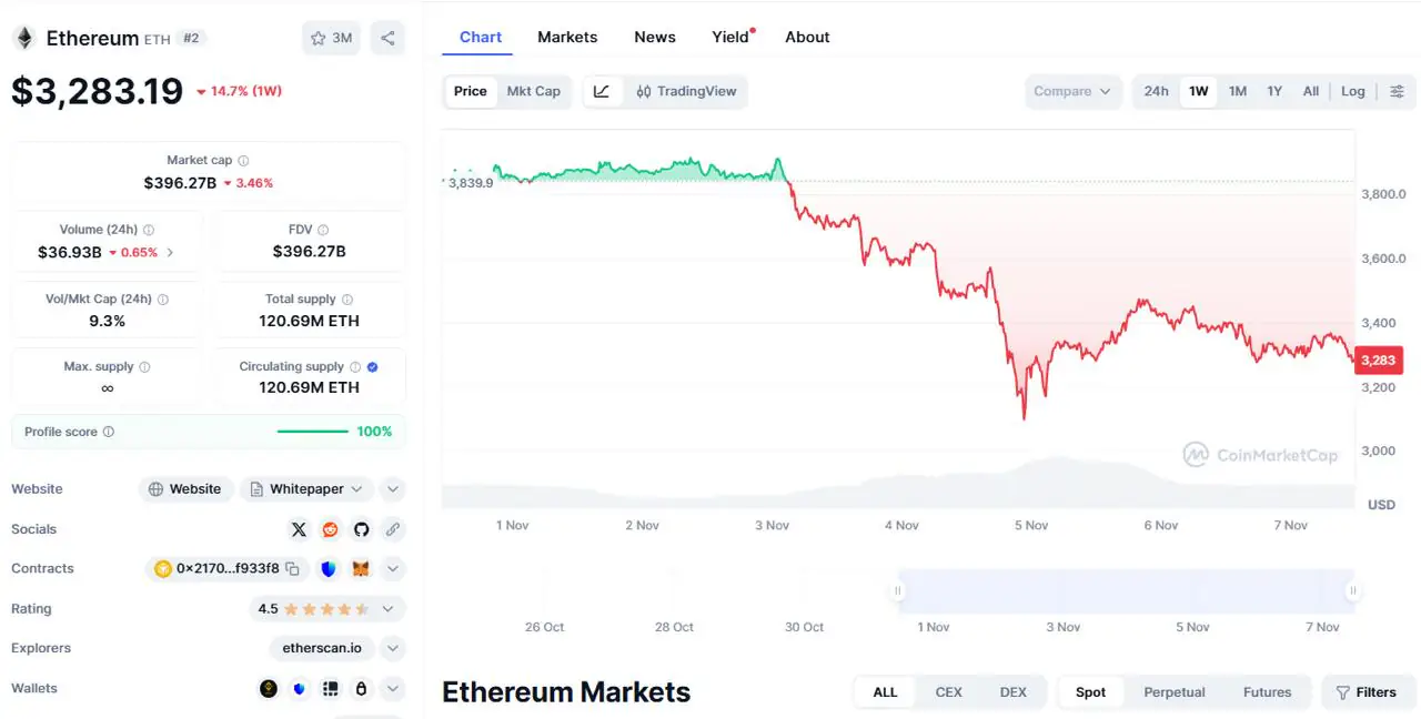 价格走势表明,ETH价格在上周的抛售潮中未能守住3500美元区域后,目前已稳定在3250美元的支撑位附近。过去几个交易日的K线图显示,市场参与者仍存在不确定性。