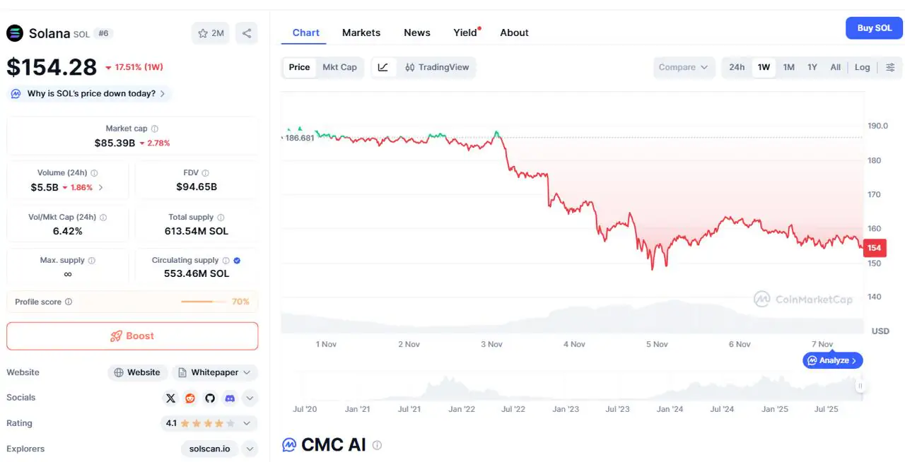 Solana 的价格在 10 月下旬从 200 美元左右大幅下跌后趋于稳定,此前该价格曾受到巨大的抛售压力。CoinMarketCap 数据数据显示,Solana 的交易价值在 150-160 美元左右。