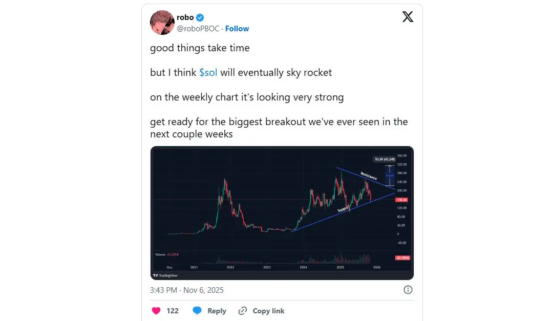 Robo也是他看好Solana的价格。他指出,该山寨币的交易价格处于对称三角形形态内,如果买盘动能增强,价格可能突破320美元,因此Solana是当前下跌趋势中值得买入的山寨币之一。