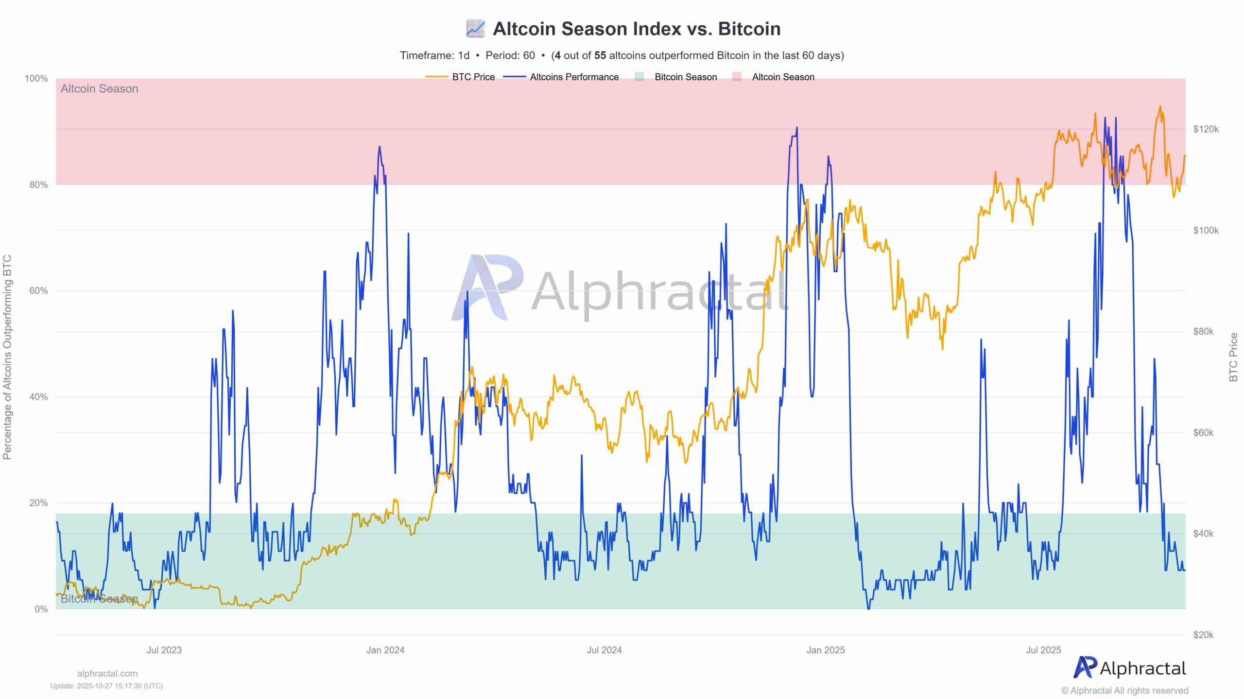 比特币可能仍领先山寨币季节指数,但事情正在发生变化。