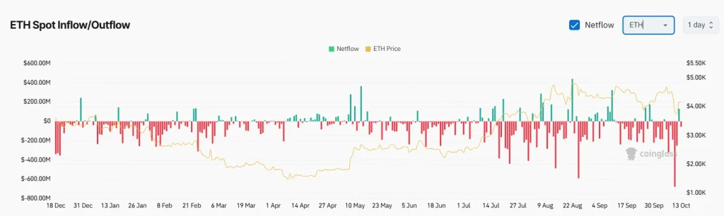 ETH 现货净流出量触及 7 个月低点,随后价格反弹至 4,147 美元,暗示买家回归。