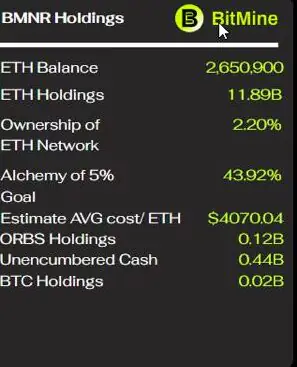 这种积极的积累不仅仅是机会主义,而是一种在价格下跌时买入的刻意策略,BitMine 公开表示其长期目标是控制近 5% 的流通 ETH。