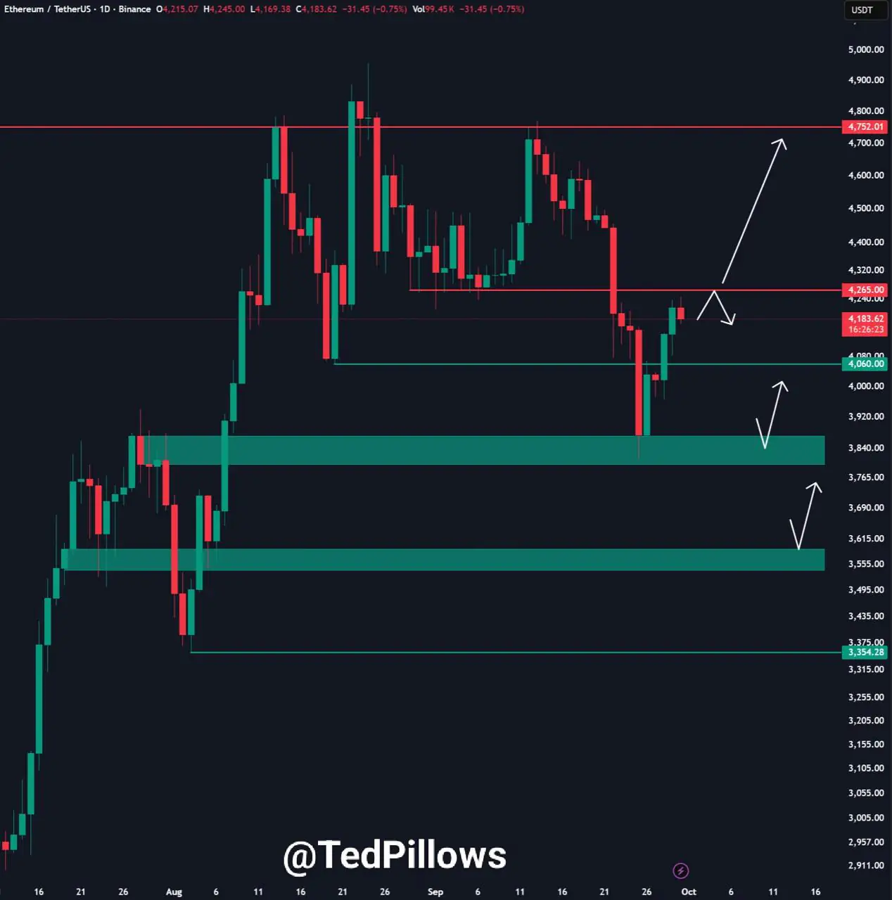 以太坊重新站上 4,050 美元的支撑位,显示出近期上涨后新的购买兴趣。挥发性