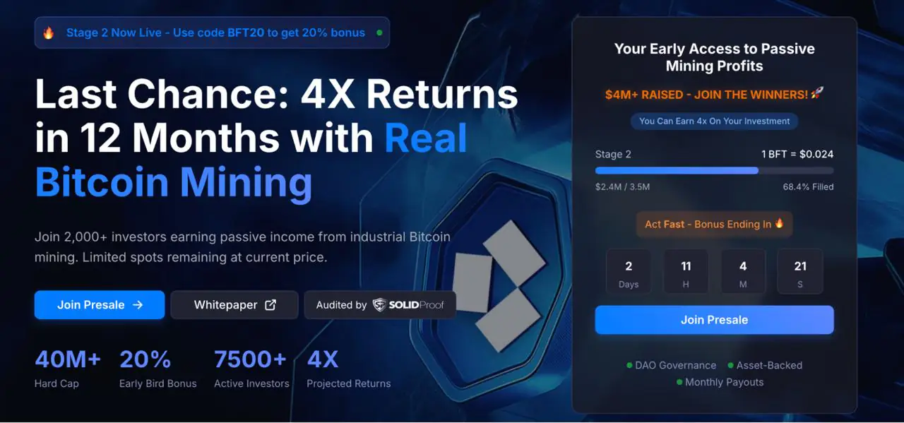以太坊面临着不断变化的市场流动,但Bitfrac代币预售需求清晰,增长结构合理,项目正在稳步推进。第二阶段将继续吸引投资者,并有望在未来一年实现四倍回报。凭借资产支持证券、月度收益分配和明确的配置,该项目将自身定位为矿业领域的独特参与者。