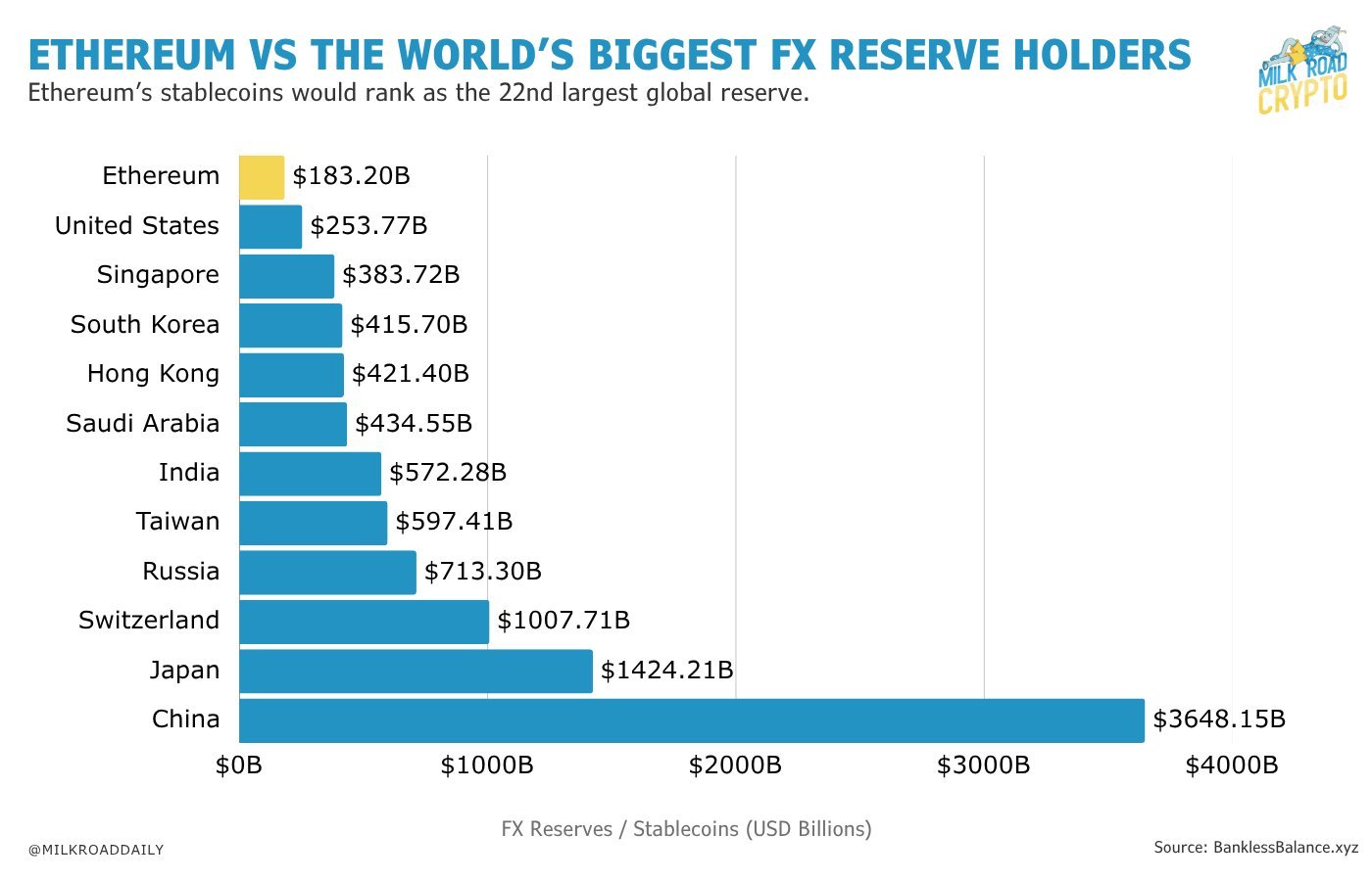 以太坊的稳定币堆栈目前储量为 1830 亿美元——足以跻身全球第 22 大储量之列。