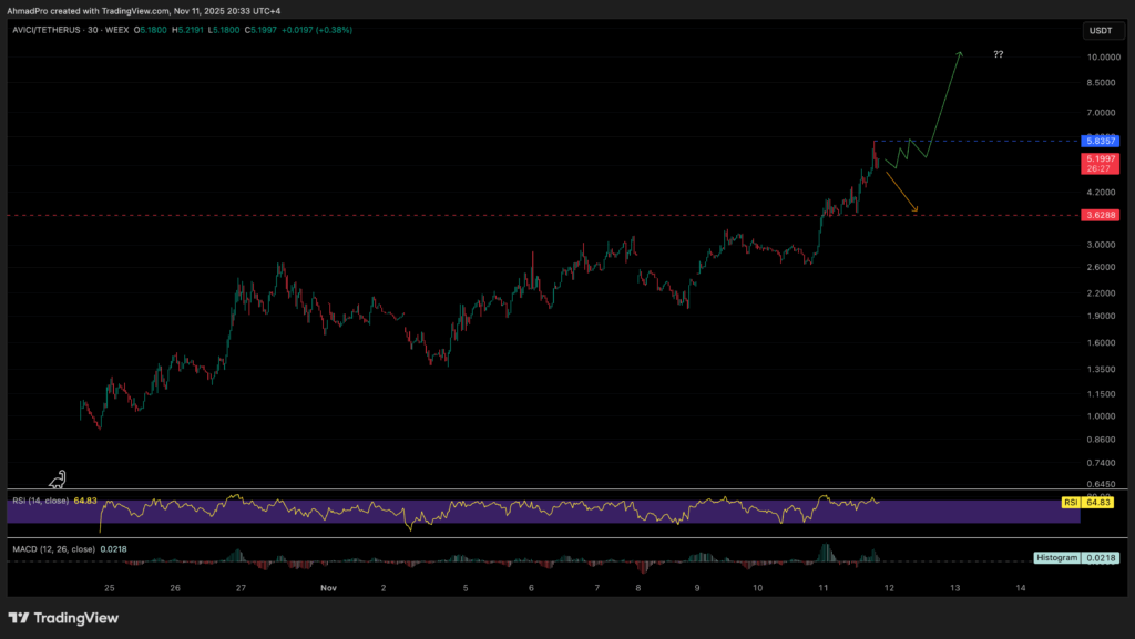 相对强弱指数 (RSI) 徘徊在 65 左右,显示出健康的强势,尚未超买;移动平均收敛/发散指标 (MACD) 也保持正值,表明看涨压力持续存在。如果价格能够守住 5.0 上方并在该水平附近获得支撑,那么下一次突破的目标位可能是 8 甚至 10,正如绿色预测所暗示的那样。