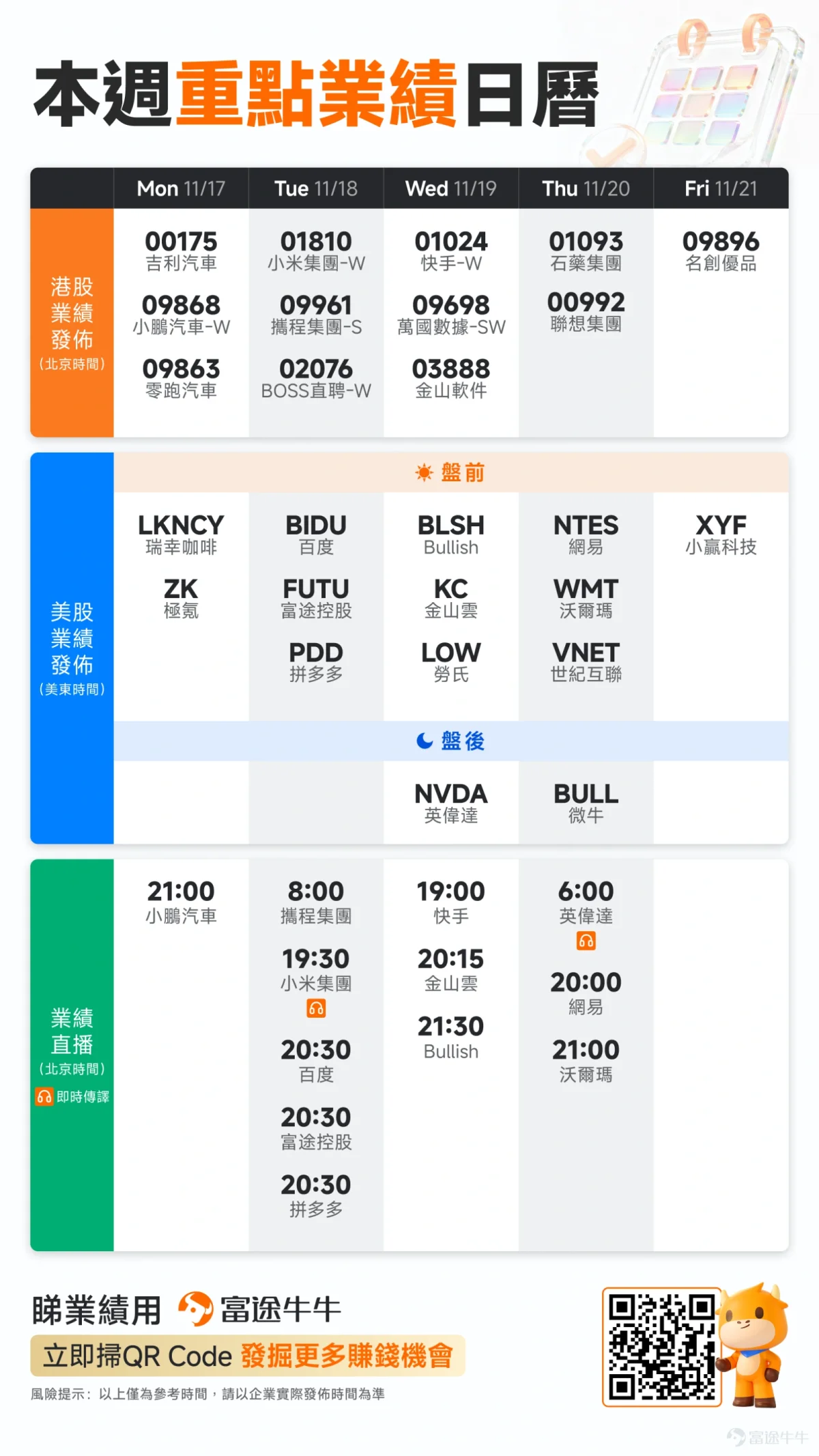 业绩方面, $小鹏汽车 (XPEV.US)$ 、 $吉利汽车 (00175.HK)$ 、 $零跑汽车 (09863.HK)$ 将于港股盘后发布业绩, $瑞幸咖啡 (LKNCY.US)$ 、 $极氪 (ZK.US)$ 将于美股盘前发布业绩。