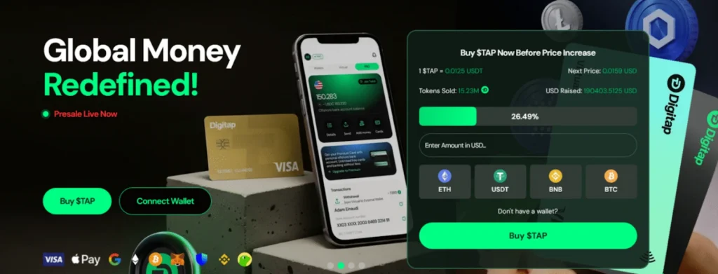 降息将降低借贷成本,简化资金流动,从而改变支付行业。传统银行仍受困于旧有模式,而 Digitap 则提供即时结算服务,并收取 1% 的汇款手续费。Digitap 是顶级加密货币之一,将在 2025 年引领行业发展。