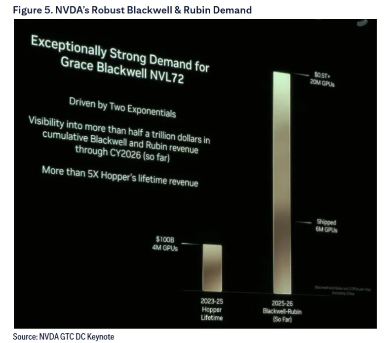 报告指出,这一乐观预测的背后,是英伟达Blackwell架构GPU的强劲出货势头。花旗分析师认为,英伟达在GTC Washington大会上透露的已出货600万个GPU的信息,是其10月季度和1月季度业绩可能超预期的有力信号。