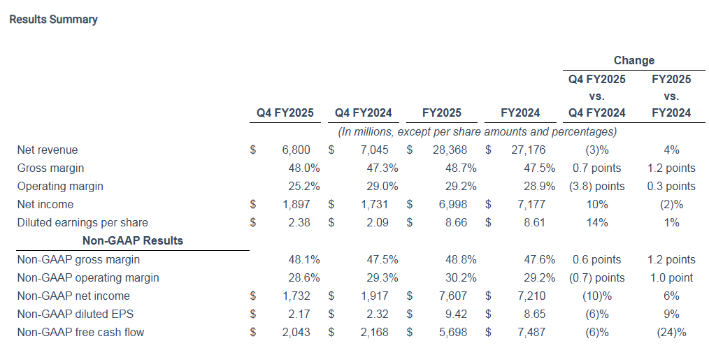 财报显示,应用材料Q4营收同比下降3%至68.00亿美元,好于分析师普遍预期的66.8亿美元。在Non-GAAP会计准则下,净利润为17.32亿美元,同比下降10%;调整后每股收益为2.17美元,好于分析师普遍预期的2.11美元。