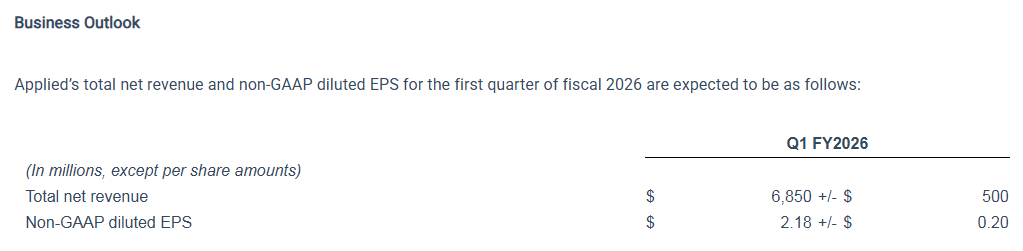 应用材料公布了好于预期的2025财年第四财季业绩,同时给出了好于预期的2026财年第一财季营收指引,表明用于AI芯片生产的设备需求可能将抵消行业部分领域的疲软。