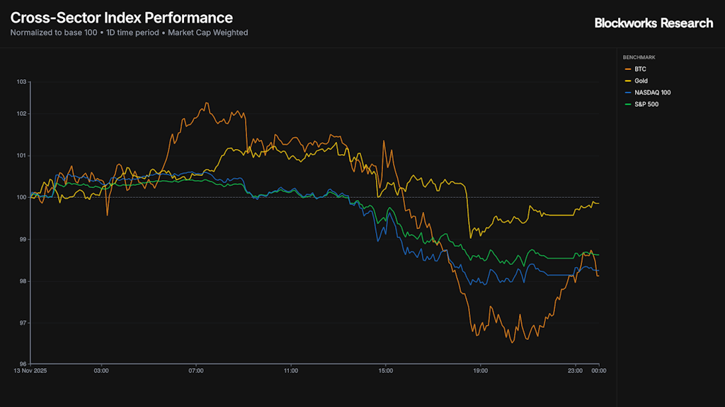 由于市场对12月降息前景存疑,风险资产遭到抛售。比特币昨日下跌1.87%,今早一度跌破95,000美元,跌幅扩大。美国股市也遭遇避险潮,纳斯达克指数和标普500指数分别下跌1.74%和1.37%。与此同时,黄金相对强势,收盘基本持平。