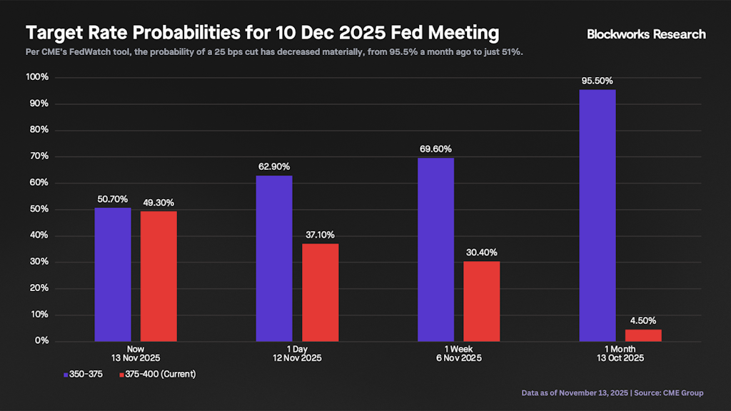 从宏观层面来看,美联储成员反对在12月降息,尤其是在政府停摆导致就业和通胀数据匮乏的情况下。明尼阿波利斯联储主席尼尔·卡什卡利昨日表示,他不支持上次降息,并指出他尚未决定下月政策会议的最佳方案。下图清晰地展现了市场预期的突然转变。截至11月13日,芝商所FedWatch工具预测降息25个基点的概率仅为51%,而前一天为63%,一个月前则超过95%。