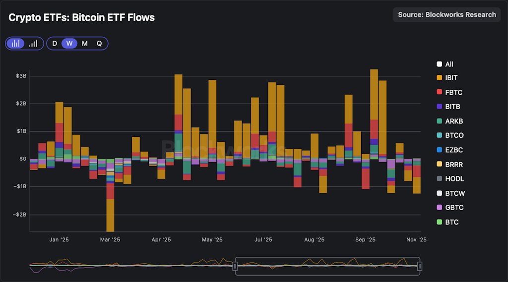 近期宏观经济的不确定性对比特币造成了沉重打击,比特币ETF昨日净流入量创下历史第二大纪录。比特币ETF资金流出近8.7亿美元,这意味着我们将连续第三周出现资金负流。上一次比特币ETF出现连续三周或更长时间的资金流出是在今年2月至3月期间,当时比特币价格跌破8万美元。下图显示了各比特币ETF产品的每周资金流动情况,本周数据尚未完全纳入统计。