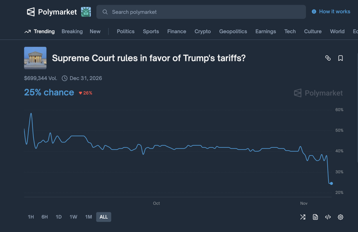 截至 11 月 6 日,Polymarket 上约有 75% 的交易员押注关税将被排除。